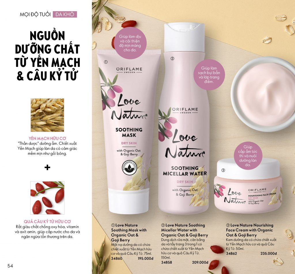 Sản phẩm dưỡng da Love Nature từ Oriflame, đặc biệt dành cho làn da khô với thành phần chiết xuất từ Yến Mạch và quả Kỷ Tử hữu cơ.